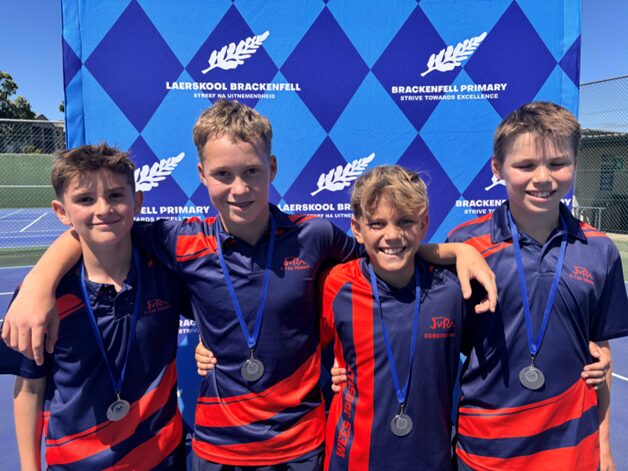 Ons o.13A-seunspan (foto onder, v.l.n.r.: Kohl Kushner, Nils le Roux, Rafa Lamprecht en Ben Esterhuyse) het puik gevaar en ongelukkig in die finaal verloor en dus ’n 2de plek behaal. Ons o.13A-dogterspan (foto onder, v.l.n.r.: Maia du Toit, Jeanne van Heerden, Annalene Viljoen en Mia-Lynn Podesta) het ’n derde plek behaal. Baie geluk aan ons Hoof van Tennis, juf. Suné, en ons eerstespanspelers met die puik prestasies.