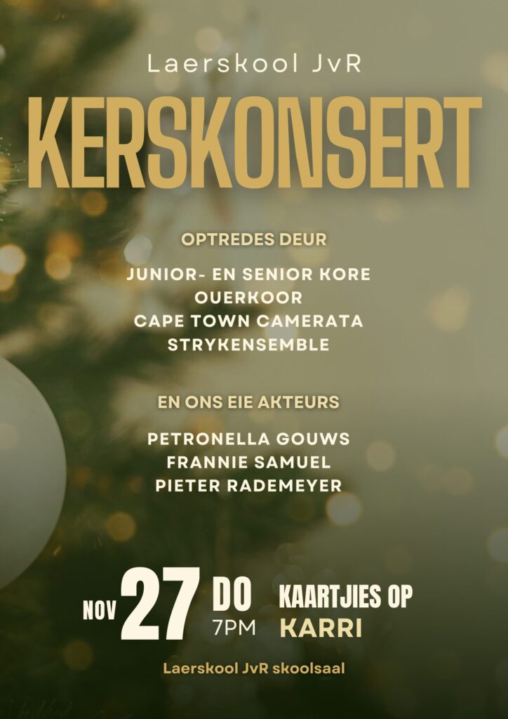 Kerskonsert – Donderdag, 27 November 2025 6 Nov, 2025 | Konsert, Kuns en Kultuur, Nuus Kom geniet ’n betowerende aand vol musiek en feesvreugde tydens ons jaarlikse LsJvR Kerskonsert! 📅 Datum: Donderdag, 27 November 🕖 Tyd: 19:00 💳 Kaartjies: R50 (beskikbaar op Karri)