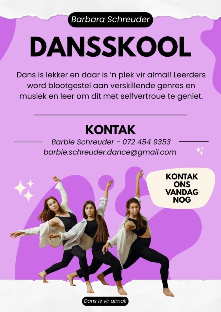 Die Barbara Schreuder Dansskool bied Moderne Dans, Contemporary, American Ballet Awards en Choreografie aan leerders van Graad 1 tot Graad 11. Klassen begin vanaf Maandag 19 Januarie 2026.