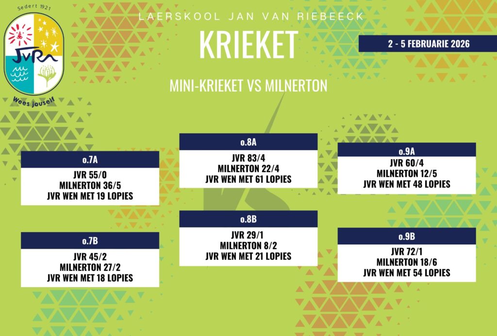 Krieketuitslae: 2 – 5 Februarie 2026 6 Feb, 2026 | Nuus, Sport, Sport, Sportuitslae Hier volg die week se krieketuitslae: