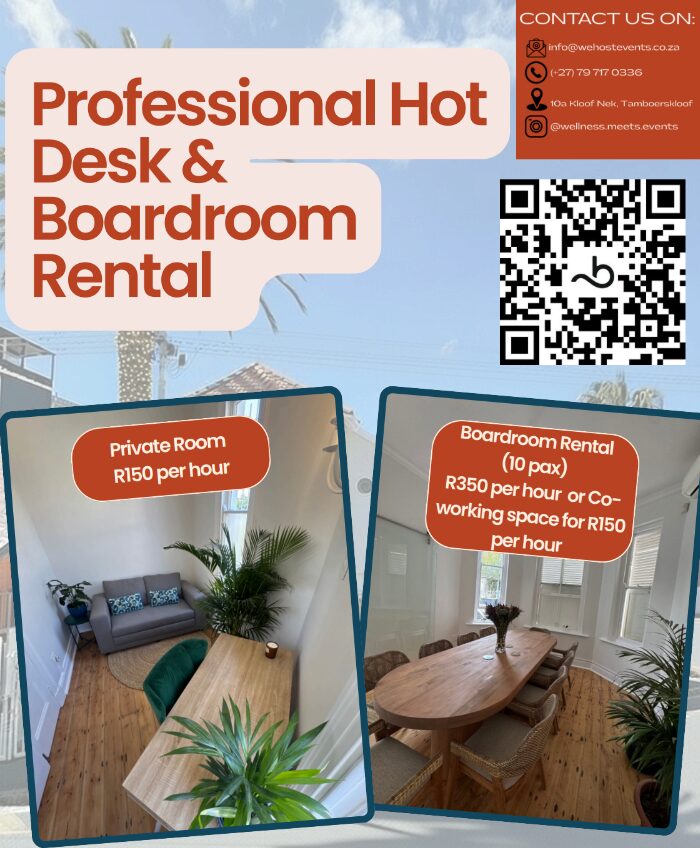 We offer beautifully designed hot desk office space, a fully equipped boardroom, and a rooftop social & braai area — all conveniently located right next to the school.