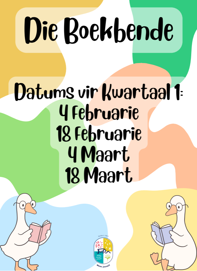 Boekbende: Nuwe Datums 11 Feb, 2026 | Nuus, Algemeen Die Boekbende gaan nou elke tweede Woensdag van die maand in die Mediasentrum om 07:15-07:45 bymekaar kom. Kyk asb na die datums in die advertensie, sodat jy nie uitmis nie! Boekbende-groete!