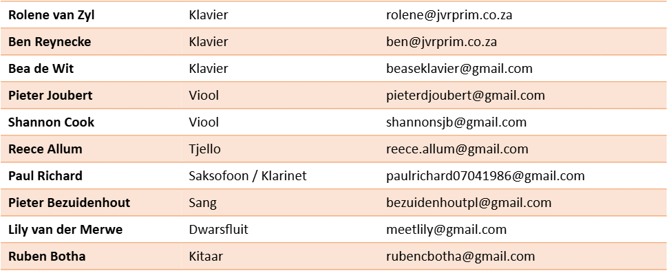 Ek lys die musiekonderwysers en kontakbesonderhede: