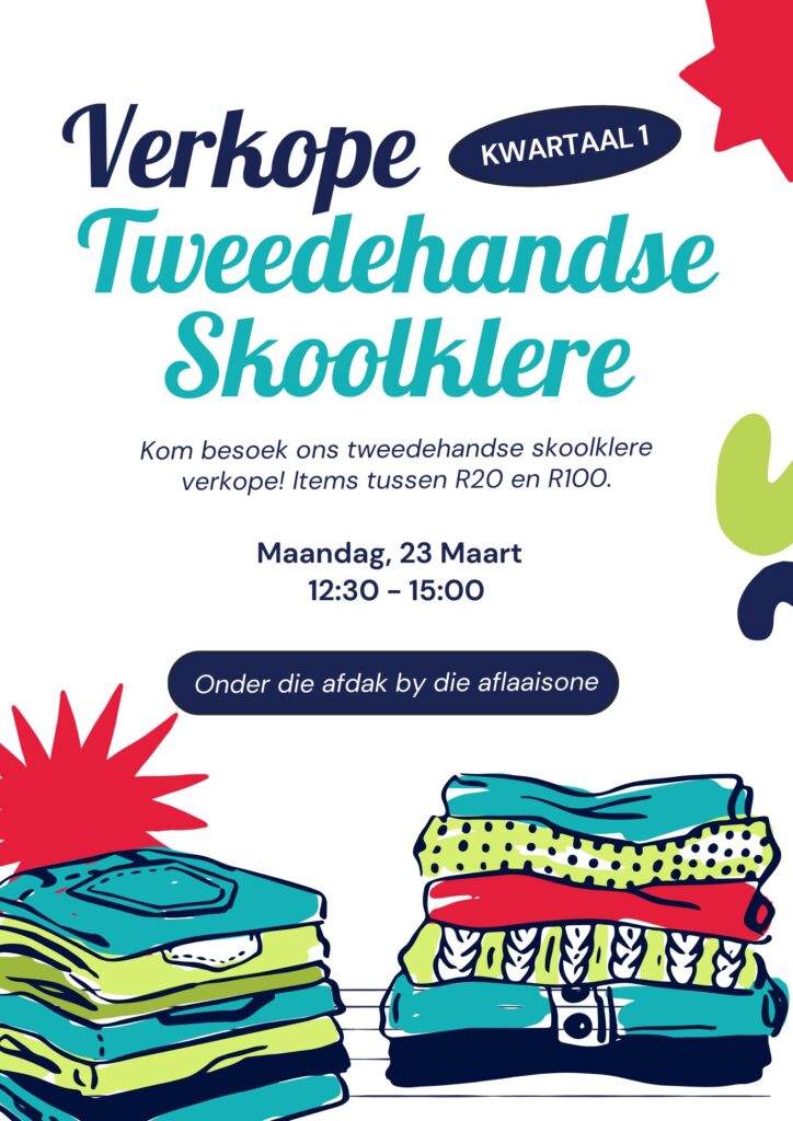 Tyd om jou kas op te knap en lekker skoolklere teen bekostigbare pryse te kry! Ons tweedehandse skoolklereverkope vind op Maandag, 23 Maart, van 12:30 tot 15:30 plaas.