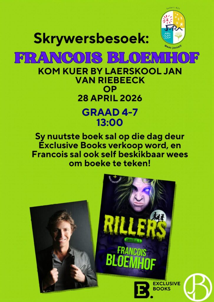 Skrywersbesoek: Francois Bloemhof 16 Apr, 2026 | Nuus, Algemeen Sien meer inligting oor die volgende skrywersbesoek hier onder: